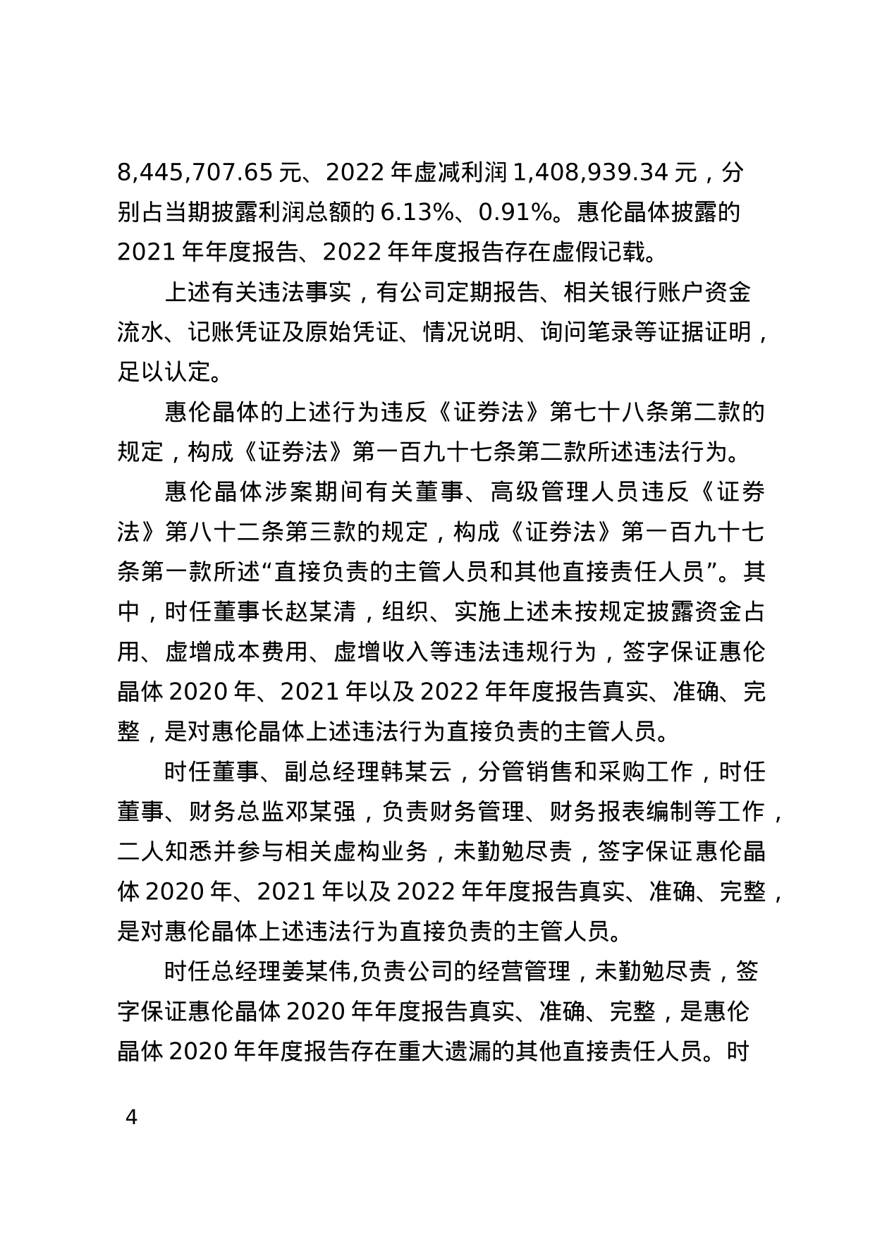上述四肢违背了《证券法》的划定。时任董事长赵某清,时任董事、副总司理韩某云,时任董事、财务总监邓某强,时任总司理韩某玲,时任总司理姜某伟对以上四肢负有包袱。