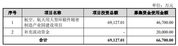 航宇科技本次向不特定对象刊行可转机公司债券的召募资金总数不逾越66,700.00万元(含66,700.00万元),扣除刊行用度后的召募资金净额将用于“航空、航天用大型环锻件精密制造产业园开辟样式”以及“补充流动资金”。