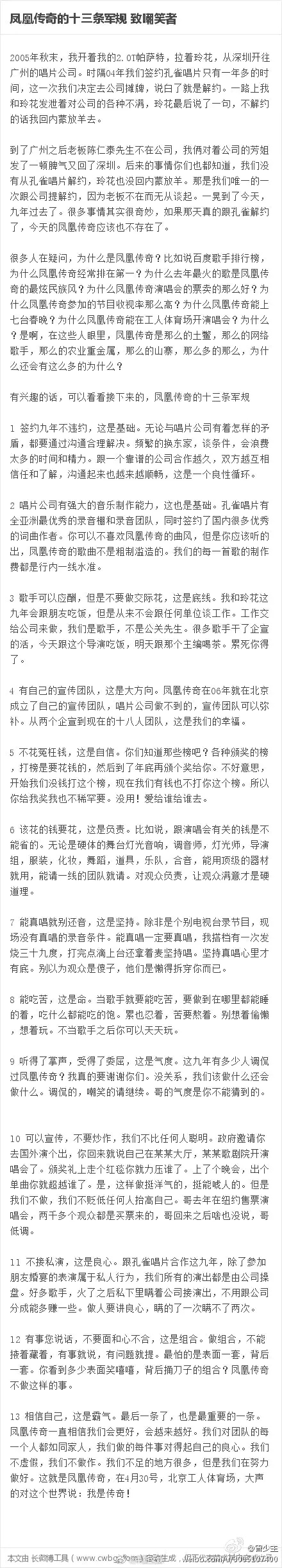 据中新娱乐报谈,玲花和曾毅早年还定下十三条团规,代表着对演艺功绩的真挚,这些限定亦然刻进了凤凰传奇和不雅众们的DNA!